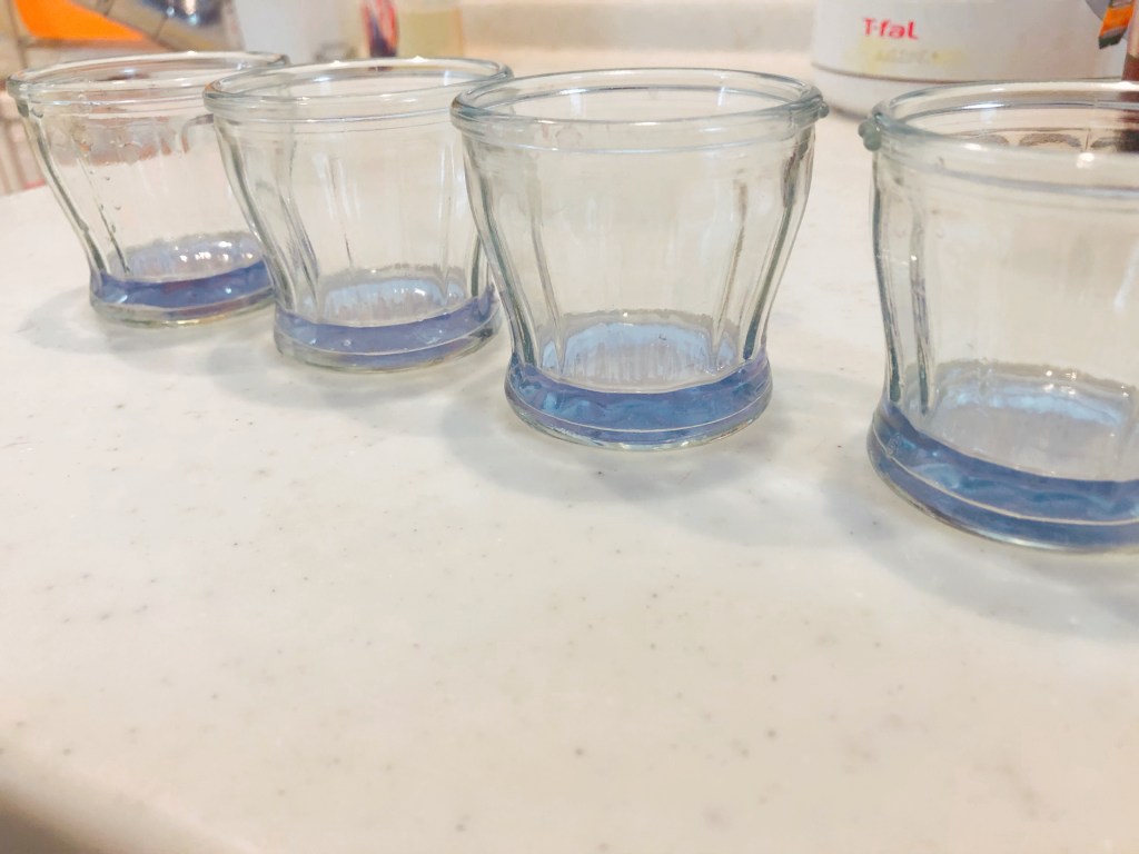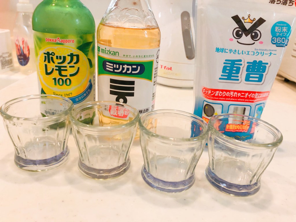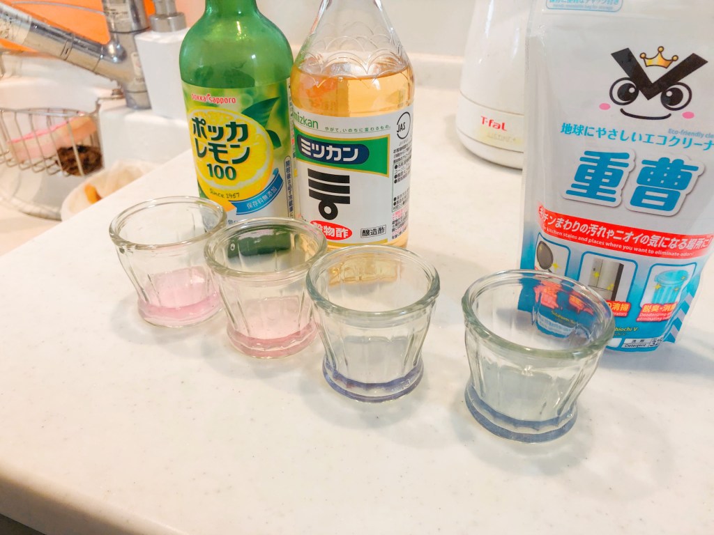 今回は、左から順に、レモン汁、酢、コントロール(何も加えない)、重曹の順に加えてみました。