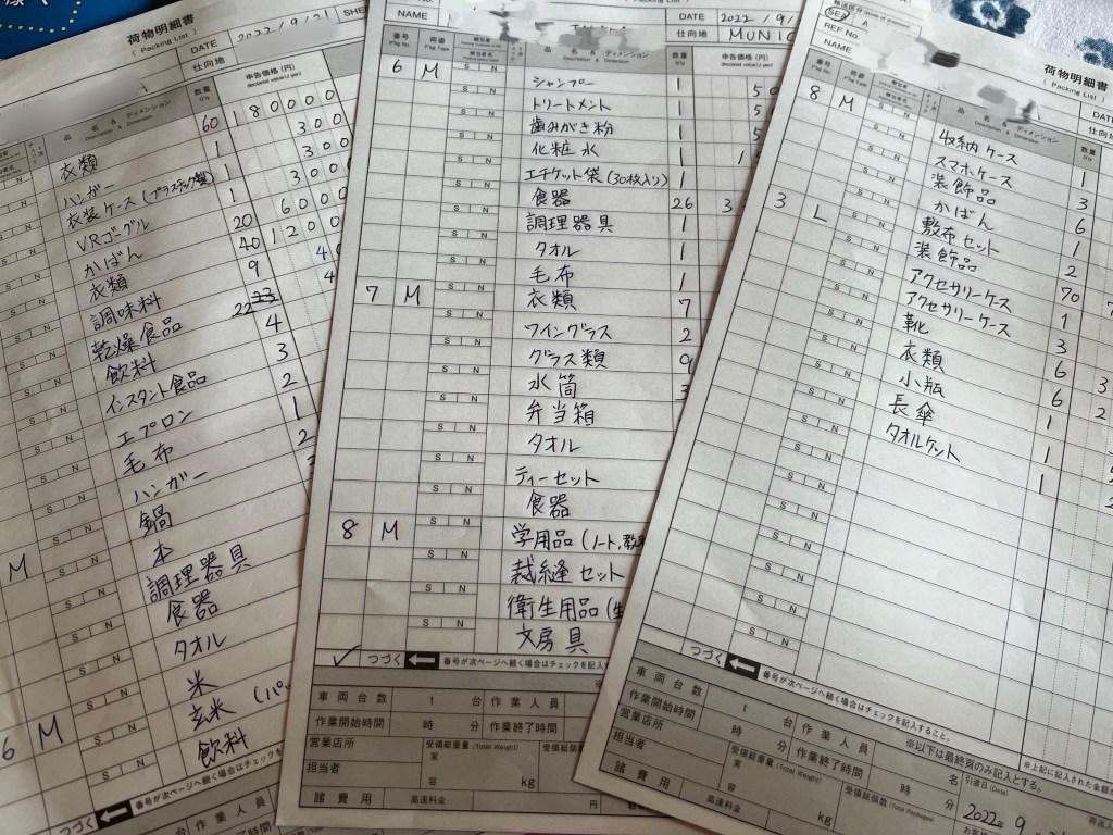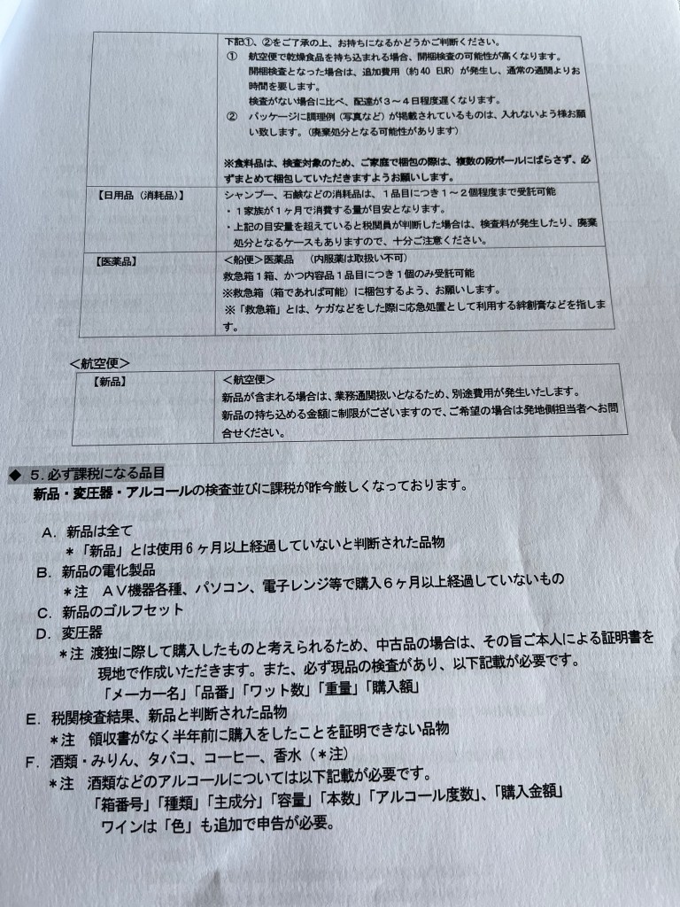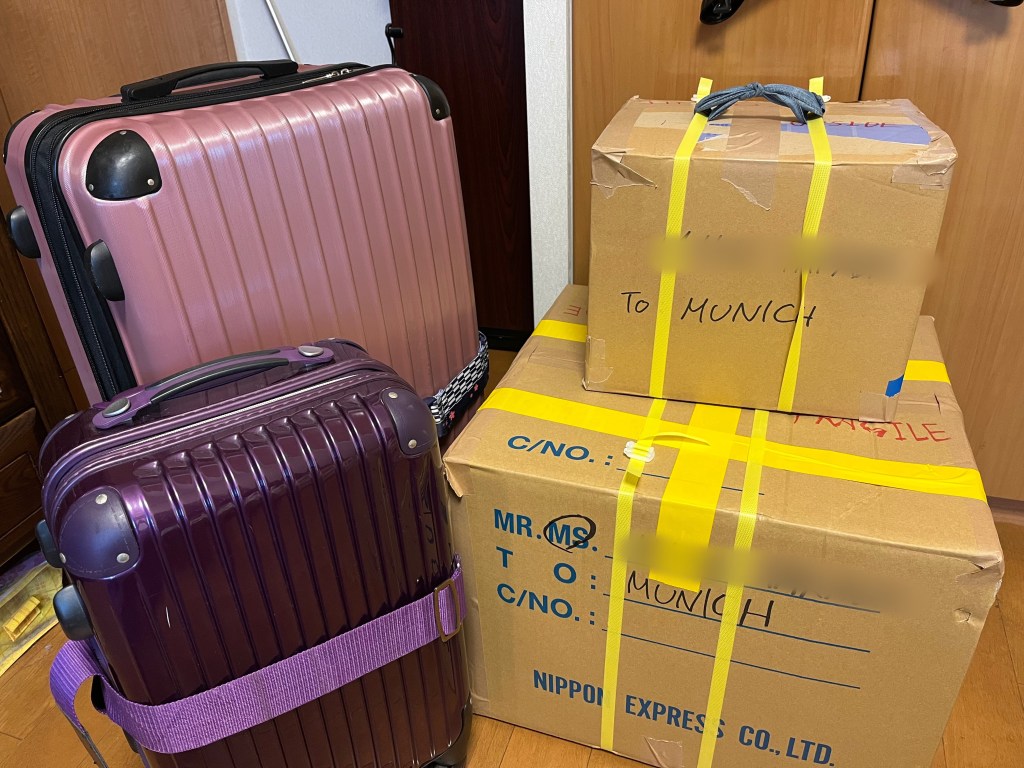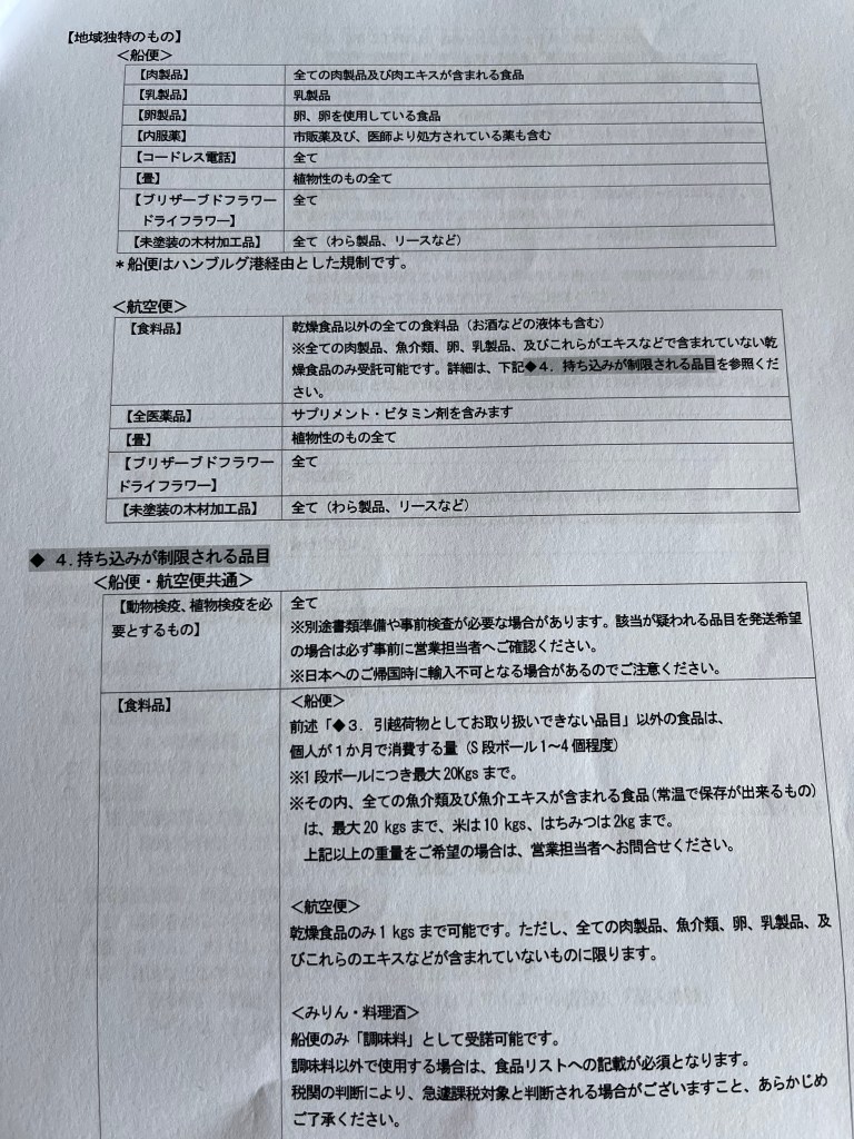 ①船便で送るもの:日通さんにお願いする荷物たち。東京-ミュンヘンでだいたい50〜70日かかるそうなので、すぐ使うものは避けましょう。私は秋〜冬に向けての渡独だったので、夏服は全部船便にしました。あと、中身のリストや新品のものや食品リスト(新品や食品は課税対象なので別途必要)も記入しないといけないので、箱を閉じる前にリストにちゃんと記載しておきましょう。 また、送れないもの、送ってもいいけど制限されてるものなど、事前にチェックして、どうしてもわからない場合は送ってしまう前に引越し業者の担当者の方に問い合わせしましょう💡妹子はチャットなのをいいことにかなりたくさん(「スポーツドリンクの粉って送れる?」「貴金属ダメだけど、安価なアクセサリーは送っていい?」など)聞いてしまいました😅